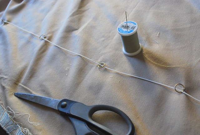 Step Five:  Secure your loops to your fabric every six inches with a needle and thread, directly underneath the screw eyes mounted on farthest edges (see also above diagram).  Make sure your loops are straight both horizontally and vertically to ensure proper and even gathering of your fabric.