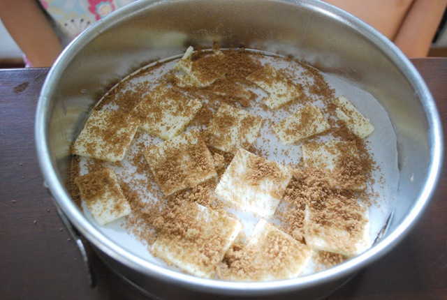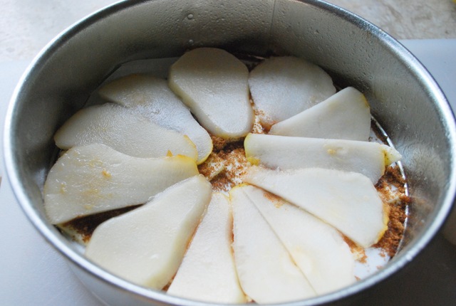 Lightly butter or use cooking spray to grease your 9 inch cheesecake pan. If yours has a dimpled bottom like mine, you can add one or two pieces of parchment paper to the bottom to avoid a dimpled pear top. Make thin slices with your 1/4 cup of cold butter, and layer on the bottom of your pan. Sprinkle with a mixture of 1 tbsp brown sugar and 3/4 tsp cinnamon.