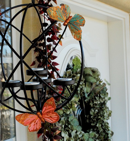 It blends well with the embellished candle globes suspended on the front porch, and still leftover from our Halloween decor.