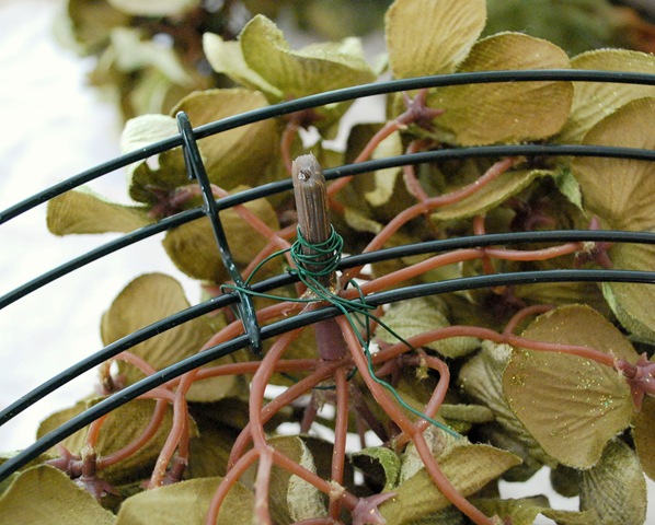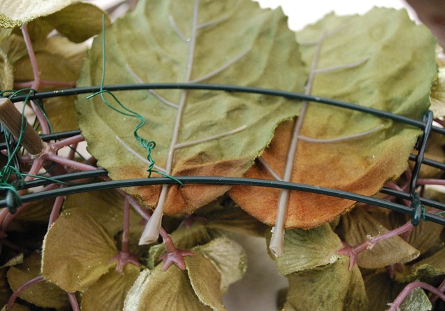 Then, clip the leaves and use them to hide any bare spots in your wreath.  Weave them through the wires to camouflage any visible wire.   Secure with more floral wire.