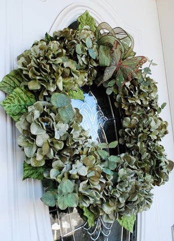 All of my supplies were found at Michael’s.  I used an 18” wire wreath, ten hydrangea blooms on sale, two eucalyptus blooms on sale, a whimsical fall butterfly, some ribbon, wire cutters, and some floral wire.