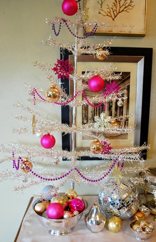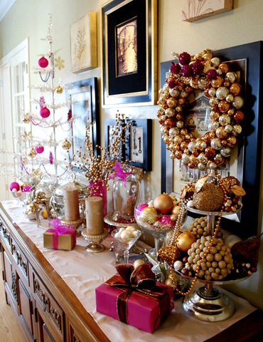 Love this! The pink, silver, gold…all makes such a wonderful display. Love the wreath hung over the picture! You’re so lucky to have an “assistant” especially one with such talent for decorating!