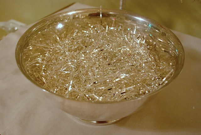 I brought out some of my silver, gave it a good polish, then embellished with some gold accents. I also shopped my home, and raided my party supplies stash to add some unexpected elements.
