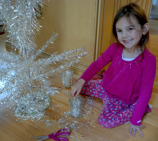 We had a silver tinsel tree but it was a little shaggy. I enlisted some help to trim it up.