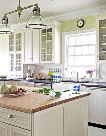 Gorgeous inspiration pictures. Loving the soft green color against the bright white. Perfect combination of the colors. My kitchen is painted a bright white with lots of touches of burgundy for the chair rails, doors and window sills. We love it.