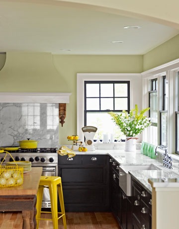 Here’s a nice mixture of black cabinets with marble countertops and green walls.