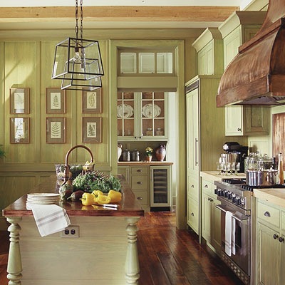 We just remodeled our kitchen and I chose blue wall paint but am accenting with green and red, so I can wait to see your version with the green walls. We decided to take our medium oak cabinets in a new direction by painting the upper ones cream and staining the bottom ones ebony. I love the look, somewhat of a collected look, I am hoping in the futre to build an island and paint in green and distress it heavily so it will look found, not made.