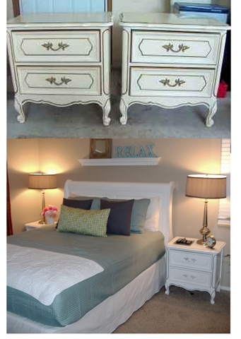 Liz took some nightstands with an old paint job and freshened them with some white paint to flank her bed. Oooh la la.