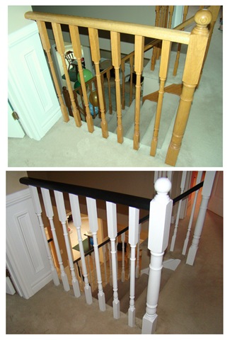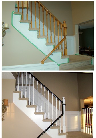 “When I saw your before staircase photo I’m thinking – that is MY staircase (except my same beige carpeting surrounds the spindles – eeew!). The same one I loved when I moved into my house 15 years ago that was so lovely. But now it looks kinda . . . dated. When I saw that you had transformed your honey oak staircase, I knew I had to do that also. I summoned all my courage and took the plunge.”