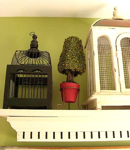 These pears on my living room mantel were collected one at a time and I love their varying shades of green. One of them was bought at TJ Maxx and the others were found elsewhere, one a gift from a thrifting friend and the other from a yard sale. I repainted one of them to enhance the green, but I love how they all relate to each other even though they were found at completely different times. A perfect accent on the mantel.