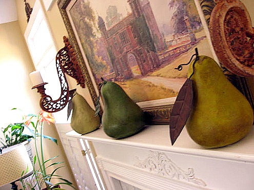 Love the green paint, it looks so fresh! My favorite is the pears on the mantel, I keep a bowl of ceramic pears in a silver bowl on our dining table, and it brightens up the whole room!
