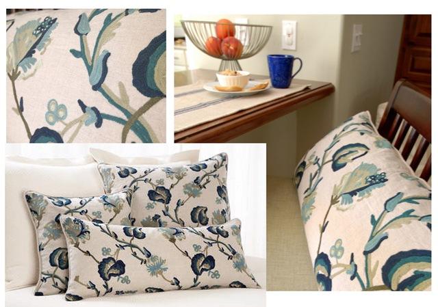 I love taupe links and blue crewel pillows!