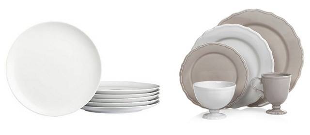 I like Crate and Barrel’s Essential White plates you can purchase by themselves. Six white dinner plates will run you $28, the salad plates are $4 each. Z Gallerie’s St. Helena dinner plates are on sale for $28 for four, salad plates are four for $24.