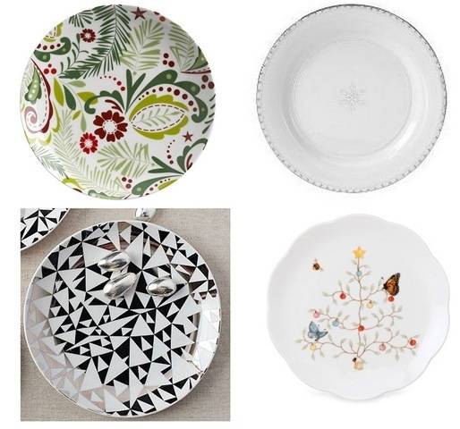 Jolly salad plate ($6 each); First Frost salad plate ($18 for 4); Winter canape plate (4 for $23); Lenox butterfly Christmas tree salad plate (4 for $30);