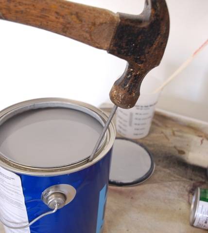 Once the primer was dry, I cracked open one of BM’s perfect grays called ‘Pewter’. Do you use the nail trick? Puncturing a few holes in the rim helps drain your paint so it doesn’t collect in the lid. When you go to close your paint up, it makes for a cleaner seal!