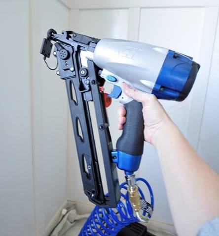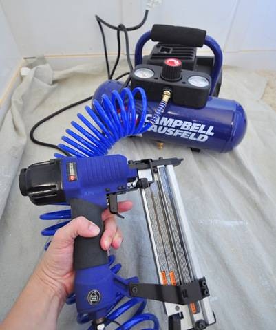Two power tools that we used to get the job done were the Campbell Hausfeld 18 gauge 2-in-1 Brad Nailer & Stapler and the Campbell Hausfeld Angle Finish Nailer.