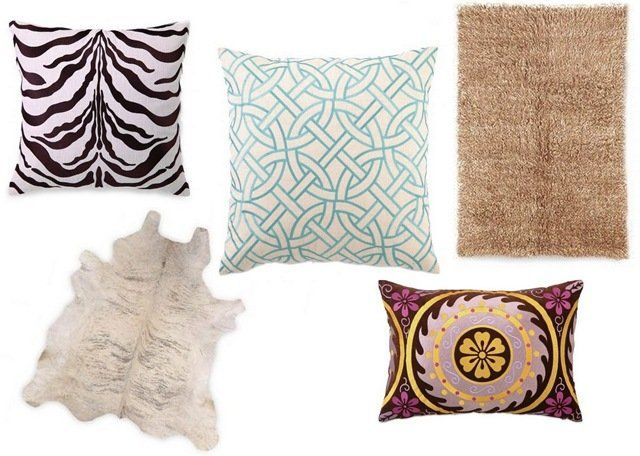 Gorgeous designer pillows, cowhide and flokati rugs.