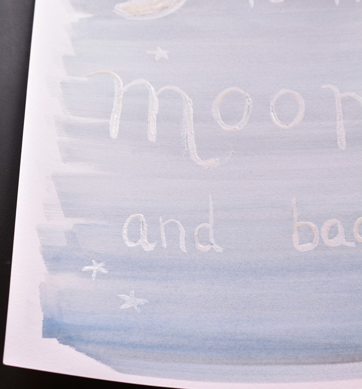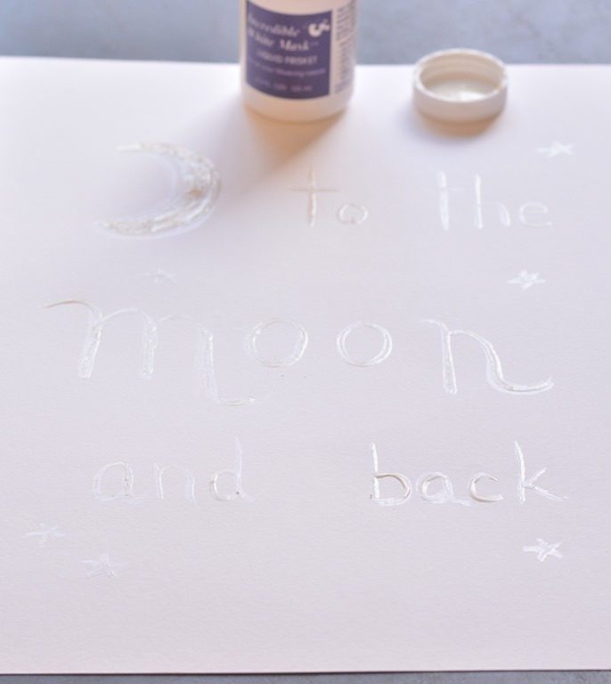 What is liquid frisket you might ask? I had no idea myself until I read the label, but it’s a peel away masking fluid that retains white areas and prevents paint from adhering to paper. Cool! I thought of my one year old nephew and a favorite book, so I used the frisket to freehand a popular quote from a children’s book.