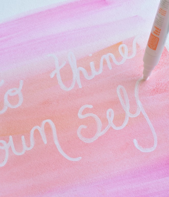 Watercolor art is de rigueur and admittedly I’m a fan of its use in textiles and prints. I had an idea to create frameable quotes in white lettering with a watercolor brushstroke background so we picked up some brushes, papers, and paints and I experimented with two separate methods.