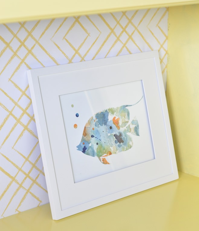 Sources for additional décor if available: white resin chair; just keep swimming and fish watercolor art; crab watercolor art. This beautiful sunny yellow paint is Benjamin Moore’s ‘Limon’.